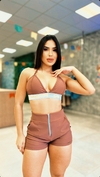 Conjuntinho Cropped Top Letreiro com bojo Removível e Shorts cintura alta veste super bem.