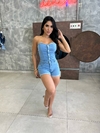 Macaquinho jeans tomara que caia, curto, colado veste super bem.